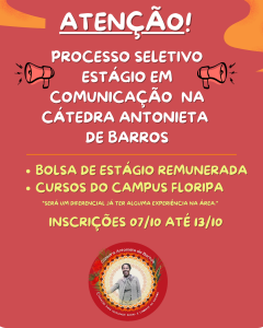Cátedra Antonieta de Barros torna público edital 03/2025 – Seleção de processo de seleção de estudante de graduação para estágio não obrigatório na área de comunicação/2025, aqui!